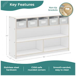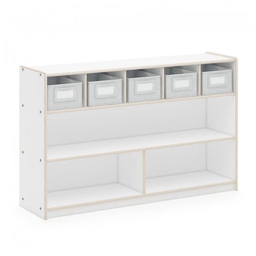 A parte superior oferece 5 nichos alinhados, ideais para caixas, livros de tamanho médio e materiais de uso frequente, enquanto as duas prateleiras inferiores contínuas acomodam jogos em caixa, brinquedos maiores e cestas organizadoras. O produto inclui 5 caixas de tecido que se encaixam nos nichos superiores, com dimensões aproximadas de 20,3cm de largura, 27,9cm de profundidade e 12,7cm de altura cada, facilitando a categorização de materiais.?