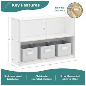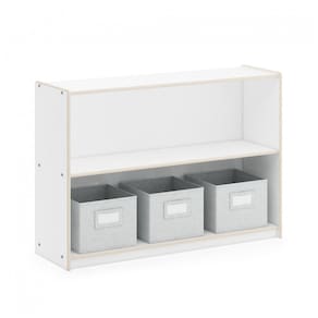 Estante baixa infantil de armazenamento em madeira, com duas prateleiras abertas e fundo fechado, indicada para organizar livros, brinquedos e materiais escolares em salas de aula, quartos infantis e espaços de estudo. O acabamento branco em laminação de fácil limpeza e os cantos arredondados oferecem visual neutro e seguro para ambientes educativos e domésticos.?