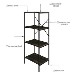 Estante C/04 Prateleiras 118x45x33cm Tub Tueh1144 Carvalho Dark - Carvalho Dark / Sobre o ProdutoEstante C/04 Prateleiras 118x45x33cm Tub TUEH1144 Branco Chess - Est.PretaDescrição do Produto:A Estante Tub TUEH1144 combina o estilo industrial contemporâneo com funcionalidade. Feita com estrutura tubular de aço com pintura epóxi, garante durabilidade e resistência, enquanto as prateleiras em MDP acetinado com bordas em PVC oferecem maior proteção e fácil manutenção. O design inclui barras chatas em formato X para maior sustentação e estabilidade, além de pés niveladores que asseguram o perfeito ajuste em qualquer superfície. A estante Tub é ideal para organizar e decorar diversos ambientes, como salas, escritórios ou áreas de linha Tub apresenta móveis contemporâneos com um toque de estilo industrial, ideais para sala, home office, cozinha ou área de lazer. Com estrutura em tubos de aço robustos e acabamento em pintura epóxi, cada peça oferece durabilidade e resistência. O MDP Perffect com tecnologia Microban garante proteção contra fungos e bactérias, enquanto as fitas em PVC asseguram um acabamento superior. Essa coleção é a combinação perfeita entre funcionalidade e design moderno para seu Inclusos:1 EstanteDimensões dos Produtos:Estante C/04 Prateleiras 118x45x33cm Tub TUEH1144 Branco Chess - 45 x 33 x 118 cmInformações Logísticas (Comp. X Prof. X Alt.) 162 x 34,5 x 8,5 cm - Peso: 8,6477 KgPeso Total: 8,6477 KgObservações:Não acompanha acessórios decorativos. Imagens meramente ilustrativas.Informações Técnicas / Características:- Cor do Produto: Branco Chess - Cor do Predominante: Branco- Marca: Compace- Modelo: TUEH1144- Linha: Tub- Material: Mdp- Material da Estrutura / Pés: Aço- Acabamento: Perffect Acetinado- Escala de Brilho: Fosco- Fita de Borda: Pvc - Possui Prateleiras: 4- Peso Máximo por Prateleira: 10kg- Possui Pés: 2- Pés Niveladores: Sim - Acabamento Estrutura: Epóxi-Pó- Formato: Retangular - Suporta Até (kg): 40kg- Comprimento: 45cm- Profundidade: 33cm- Altura: 118cm - Peso Lí.: 8Kg- Recomendações de Uso, Manutenção e Limpeza: Para a limpeza, utilize flanela seca ou pano macio levemente umedecido em água. Utilize um pano seco em seguida. Evite com produtos químicos (solventes, thinner, acetona, etc) e não utilize nenhum tipo de esponja de aço.- Necessita de Montagem: Sim / Acompanha Manual de Montagem- Complexidade da Montagem: Média: pode ser montado por mais de uma pessoa e/ou necessite de maior conhecimento para montagem.- Garantia: 6 meses Tipo de Garantia: Garantia do Fabricante | Duração de Garantia: 6 Meses | Montagem: Necessita Montagem | Material: Madeira,Metal | País de Origem: | Altura: 118 | Largura: 33 | Profundidade: 33 | Tonalidade: Multicolorido | Cor: Multicolorido | Produto: Estante | Marca: Compace | Coleção: Industrial | Requer Baterias: Não | Certificação Externa: Não aplicável | Componentes inclusos: Manual de montagem e kit acessórios | Comprimento: 80 | Peso: 8,00 | Preço de tabela: 150 | Fabricante: Compace | do Modelo: TUEH1144 | de Caixas: 1 | de Itens: 1 | da Peça: TUEH1144 | Cômodo indicado: Escritórios | Material da Estrutura: Aço | Quantidade de itens: 1 | Principais Características do Produto 0: Aço | Palavras-chave de Pesquisa: Não Aplicável | Principais Características do Produto 1: MDP | Principais Características do Produto 2: Pvc | Exige montagem: true | Peso do item: unit=kilograms;value=8 | Dimensões do item P x L x A: depth#value=33;width#value=45;depth#unit=centimeters;width#unit=centimeters;height#value=118;height#unit=centimeters Cor: Carvalho Dark /