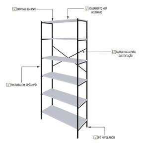 Estante C/06 Prateleiras 186x80x33cm Tub Tueh1886 Branco Chess - Branco Chess / Sobre o ProdutoEstante C/06 Prateleiras 186x80x33cm Tub TUEH1886 Branco Chess - Est.PretaDescrição do Produto:A Estante Tub TUEH1886 combina o estilo industrial contemporâneo com funcionalidade. Feita com estrutura tubular de aço com pintura epóxi, garante durabilidade e resistência, enquanto as prateleiras em MDP acetinado com bordas em PVC oferecem maior proteção e fácil manutenção. O design inclui barras chatas em formato X para maior sustentação e estabilidade, além de pés niveladores que asseguram o perfeito ajuste em qualquer superfície. A estante Tub é ideal para organizar e decorar diversos ambientes, como salas, escritórios ou áreas de linha Tub apresenta móveis contemporâneos com um toque de estilo industrial, ideais para sala, home office, cozinha ou área de lazer. Com estrutura em tubos de aço robustos e acabamento em pintura epóxi, cada peça oferece durabilidade e resistência. O MDP Perffect com tecnologia Microban garante proteção contra fungos e bactérias, enquanto as fitas em PVC asseguram um acabamento superior. Essa coleção é a combinação perfeita entre funcionalidade e design moderno para seu Inclusos:1 EstanteDimensões dos Produtos:Estante C/06 Prateleiras 186x80x33cm Tub TUEH1886 Branco Chess - 80 x 33 x 186 cmInformações Logísticas (Comp. X Prof. X Alt.) 186 x 34,5 x 8,5 cm - Peso: 18,891 KgPeso Total: 18,891 KgObservações:Não acompanha acessórios decorativos. Imagens meramente ilustrativas.Informações Técnicas / Características:- Cor do Produto: Branco Chess - Cor do Predominante: Branco- Marca: Compace- Modelo: TUEH1886- Linha: Tub- Material: Mdp- Material da Estrutura / Pés: Aço- Acabamento: Perffect Acetinado- Escala de Brilho: Fosco- Fita de Borda: Pvc - Possui Prateleiras: 6- Peso Máximo por Prateleira: 10kg- Possui Pés: 2- Pés Niveladores: Sim - Acabamento Estrutura: Epóxi-Pó- Formato: Retangular - Suporta Até (kg): 60kg- Comprimento: 80cm- Profundidade: 33cm- Altura: 186cm - Peso Lí.: 17,939Kg- Recomendações de Uso, Manutenção e Limpeza: Para a limpeza, utilize flanela seca ou pano macio levemente umedecido em água. Utilize um pano seco em seguida. Evite com produtos químicos (solventes, thinner, acetona, etc) e não utilize nenhum tipo de esponja de aço.- Necessita de Montagem: Sim / Acompanha Manual de Montagem- Complexidade da Montagem: Média: pode ser montado por mais de uma pessoa e/ou necessite de maior conhecimento para montagem.- Garantia: 6 meses Tipo de Garantia: Garantia do Fabricante | Duração de Garantia: 6 Meses | Montagem: Necessita Montagem | Material: Madeira,Metal | País de Origem: | Altura: 186 | Largura: 33 | Profundidade: 33 | Tonalidade: Multicolorido | Cor: Multicolorido | Produto: Estante | Marca: Compace | Coleção: Industrial | Requer Baterias: Não | Certificação Externa: | Componentes inclusos: Manual de montagem e kit acessórios | Comprimento: | Peso: 17,94 | Preço de tabela: 426.92500000000001 | Fabricante: Compace | do Modelo: TUEH1886 | de Caixas: 1 | de Itens: 1 | da Peça: TUEH1886 | Cômodo indicado: Escritórios | Material da Estrutura: Aço Cor: Branco Chess /