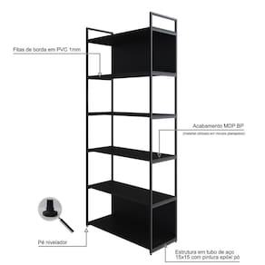 Estante C/06 Prateleiras 186x80x33cm C/fundo Yon Preto Tx/ Preto Tx/ Sobre o ProdutoEstante C/06 Prateleiras 186x80x33cm C/Fundo Yon YOEO1886F çoDescrição do Produto:A estante Yon YOEO1886F combina elegância e funcionalidade, perfeita para ambientes modernos e com estilo. Sua estrutura em tubos de aço com soldas a laser garante robustez e durabilidade, além de um excelente acabamento. Com design de linhas limpas e atemporal, oferece versatilidade para diversos usos, permitindo a criação de composições únicas e personalizadas, perfeita para organizar e exibir objetos decorativos com sofisticação e linha Yon é uma fusão elegante entre o estilo industrial e o contemporâneo. Com linhas limpas, materiais robustos e detalhes sofisticados, essa coleção é perfeita para quem busca um ambiente moderno e funcional. Os móveis desta linha oferecem uma versatilidade notável, adaptando-se a diversos ambientes e necessidades, permitindo a criação de composições únicas e personalizadas. sendo a escolha ideal para quem busca qualidade e estilo em um só Inclusos:1 EstanteDimensões dos Produtos:Estante C/06 Prateleiras 186x80x33cm C/Fundo Yon YOEO1886F ço: 80 x 33 x 185 cmInformações Logísticas (Comp. X Prof. X Alt.) 185,5 x 34,5 x 8,5 cm - Peso: 19,8646 KgPeso Total: 19,8646 KgObservações:Não acompanha acessórios decorativos. Imagens meramente ilustrativas.Informações Técnicas / Características:- Cor do Produto: ço- Cor do Predominante: Revestido- Marca: Metalig- Modelo: YOEO1886F- Linha: Yon- Material: Mdp- Material da Estrutura / Pés: Aço- Acabamento: BP- Escala de Brilho: Fosco- Fita de Borda: Pvc - Possui Prateleiras: 6- Peso Máximo por Prateleira: 10kg- Possui Pés: 2- Pés Niveladores: Sim - Acabamento Estrutura: Epóxi-Pó- Formato: Retangular - Suporta Até (kg): 60kg- Comprimento: 80cm- Profundidade: 33cm- Altura: 185cm - Peso Lí.: 18,93Kg- Recomendações de Uso, Manutenção e Limpeza: Para a limpeza, utilize flanela seca ou pano macio levemente umedecido em água. Utilize um pano seco em seguida. Evite com produtos químicos (solventes, thinner, acetona, etc) e não utilize nenhum tipo de esponja de aço.- Necessita de Montagem: Sim / Acompanha Manual de Montagem- Complexidade da Montagem: Média: pode ser montado por mais de uma pessoa e/ou necessite de maior conhecimento para montagem.- Garantia: 01 ano Marca: Compace | Modelo: YOEO1886F | Quantidade máxima de pedido: 1 | Necessita montagem: Sim | É em formato de L: Não | Comprimento: 185 cm | Altura: 33 cm | Largura: 80 cm | Profundidade: 80 cm | Material da estrutura: Aço | Produto: Estante | Cômodo indicado: Escritórios | Cor: Multicolorido | Tonalidade: Multicolorido | Quantidade de itens: 1 | Principais Características do Produto 0: Aço | do modelo: YOEO1886F | Certificação de teste externa: Não aplicável | Baterias são necessárias?: false | Palavras-chave de Pesquisa: Não Aplicável | Principais Características do Produto 1: MDP | da peça: YOEO1886F | de caixas: 1 | Principais Características do Produto 2: Pvc | Componentes incluídos: Manual de montagem e kit acessórios | Fabricante: Compace | Peso do item: unit=kilograms; | Dimensões do item P x L x A: depth#value=33;width#value=80;depth#unit=centimeters;width#unit=centimeters;height#value=185;height#unit=centimeters Cor: Preto TX/