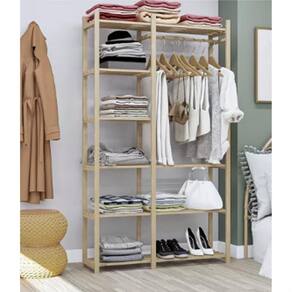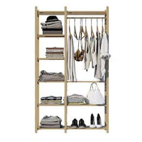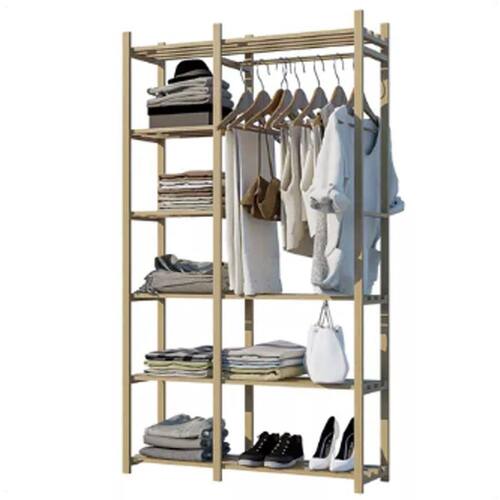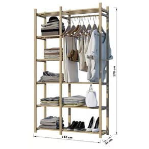 Estante arara em madeira maciça reflorestada, perfeita para organizar e otimizar espaços e ideal para quartos, lavanderias, closets e para espaços comerciais; Requer montagem, mas é muito simples e fácil. Com 8 prateleiras e com cabideiro.