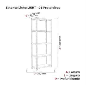 Uma estante com estrutura de aço é uma opção moderna e durável para organizar seus pertences. O aço confere resistência e estabilidade, tornando-a ideal para armazenar livros, objetos decorativos, materiais de escritório e muito mais. Além disso, a estética do aço pode dar um toque contemporâneo ao ambiente. A versatilidade desse material permite que a estante se encaixe em diversos estilos de decoração, do industrial ao minimalista. Acabamento da Prateleira: Pintura Complexidade da Montagem: Baixa: pode ser montado por uma pessoa sozinha Cor: Lilás Cor do Produto: Lilas Cor Interna: Lilas Escala de Brilho: Semi-Fosco Escala de Brilho da Prateleira: Semi-Fosco Itens Inclusos: Uma estante Linha ou Coleção: Aço Manual de Montagem e Instalação: https://product-hub-prd.madeiramadeira.com.br/921111/documents/660d550a-9578-448f-b664-85cac18446c4503Estante2020Linha20Light.pdf Material da Prateleira: Aço Material dos Pés: Polipropileno Material Principal: Aço Necessita Montagem: Sim Origem do Produto: Nacional Peso: 7,8239 kg Peso Máximo por Prateleira: 20 kg Possui Espelho: Não Possui Possui iluminação: Não Possui Pés: 04 Possui Portas: Não Possui Prateleiras: 05 Possui Rodízio: Não Recomendações de Uso, Manutenção e Limpeza: Limpeza deve ser feita com um pano levemente umedecido e um pano seco. Sapatas Niveladoras: Sim Sistema de Montagem: Parafuso Suporta Até (kg): 20 kg
