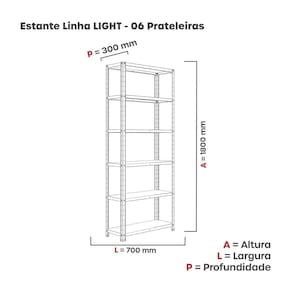Uma estante com estrutura de aço é uma opção moderna e durável para organizar seus pertences. O aço confere resistência e estabilidade, tornando-a ideal para armazenar livros, objetos decorativos, materiais de escritório e muito mais. Além disso, a estética do aço pode dar um toque contemporâneo ao ambiente. A versatilidade desse material permite que a estante se encaixe em diversos estilos de decoração, do industrial ao minimalista. Acabamento da Prateleira: Pintura Complexidade da Montagem: Baixa: pode ser montado por uma pessoa sozinha Cor: Azul DelRei Cor do Produto: Azul Delrei Cor Interna: Azul Delrei Escala de Brilho: Semi-Fosco Escala de Brilho da Prateleira: Semi-Fosco Itens Inclusos: uma estante Manual de Montagem e Instalação: https://product-hub-prd.madeiramadeira.com.br/901822/documents/c4034b8c-8d8c-4818-8875-628ba490142c463Estante2020Linha20Light.pdf Material da Prateleira: Aço Material dos Pés: Polipropileno Material Principal: Aço Necessita Montagem: Sim Origem do Produto: Nacional Peso: 9,0499 kg Peso Máximo por Prateleira: 15 kg Possui Espelho: Não Possui Possui iluminação: Não Possui Pés: 04 Possui Portas: Não Possui Prateleiras: 06 Possui Rodízio: Não Recomendações de Uso, Manutenção e Limpeza: Limpeza deve ser feita com um pano levemente umedecido e um pano seco. Sapatas Niveladoras: Não Sistema de Montagem: Parafuso Suporta Até (kg): 15 kg