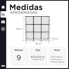 ITENS INCLUSOS: - Kit de telas e conectivos para montagem de 01 unidade de estante aramada.