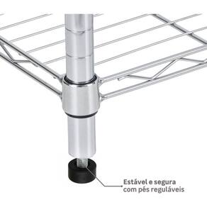 Em resumo, a Estante Utilitaria da Spaceo e uma solucao de armazenamento robusta e elegante, feita de aco cromado, com tres prateleiras que suportam ate 50 kg cada. Ela nao possui gavetas, portas, rodas ou pes, o que a torna versatil para uso em diferentes ambientes. A estante vem desmontada, e facil de montar, e tem uma garantia de 60 meses do fabricante.