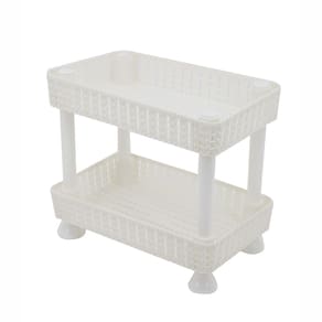 Estante de plástico multiuso Le, retangular e empilhável, com 2 prateleiras. Medindo 24,5x15x20cm, na cor branca. Ideal para organizar objetos pequenos em diferentes ambientes, fácil de montar e limpar.