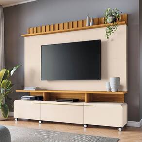A Estante de TV 70 Pol 200 cm Ripado Jane Off White/Cinamomo é a escolha ideal para compor sua sala de estar, trazendo beleza e exclusividade. Ela foi produzida em MDP e MDF de 25mm e 15mm, materiais de alta qualidade e ecologicamente corretos. Além de um design moderno e funcional a estante conta com; um painel para TV que suporta até 50 polegadas, a estante apresenta tampo e a prateleira superior com espessura de 25mm garantindo maior resistência e durabilidade ao produto, o detalhe ripado na frente é um charme à parte. Possui portas laterais basculantes com dobradiças metálicas e pistão a gás, que abrem e fecham suavemente proporcionando uma flexibilidade silenciosa. Conta também com gaveta central com corrediças telescópicas, que facilitam a abertura e o fechamento e puxadores metálicos em tom dourado conferindo um toque de sofisticação ao móvel. Seus rodízios cromados de 50mm facilitam tanto a movimentação quanto a limpeza. Esta estante foi pensada para o seu lar. Aproveite!