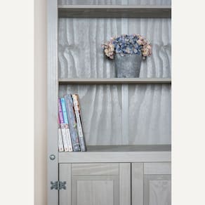 - Acabamento: Cera cor cinza lavado com veios e nós aparentes | Detalhes: Cera cor marrom antique.