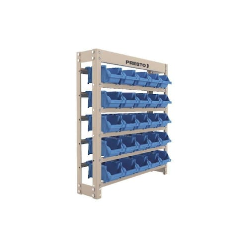 Kit com estantes em aço para encaixar gavetas plásticas, possibilitando diversos tipos de armazenagem. O Kit Estante Gaveteiro Organizador 25/3 Azul Presto é ideal para organizar parafusos e outras peças pequenas, pois facilita o acesso rápido a itens necessários para realizar o trabalho de maneira mais ágil e organizada. Estrutura em aço e 25 Gavetas Empilháveis n 3 inclusas.