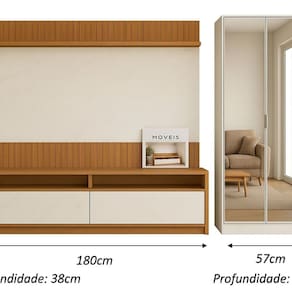 Juntos, formam um ambiente harmonioso, arejado e moderno com presença marcante e alta utilidade. Produto Montado: Sim Acabamento: Finish Foil Acabamento da Porta: Finish Foil Acabamento da Prateleira: Finish Foil Acompanha Lâmpada: 01 Acompanha Manual de Instalação: Sim Altura do Conjunto: 180 cm Altura do Espelho 01: 167 cm Altura do Espelho 02: 167 cm Altura do Painel: 124 cm Altura do Rack: 56 cm Ambiente Principal: Sala de Estar codigo_ean: 7900288206534 Complexidade da Montagem: Baixa: pode ser montado por uma pessoa sozinha Cor: Freijó Ripado / Branco Cor do Produto: Freijó Ripado / Branco Cor Interna: Branco Escala de Brilho: Semi-Fosco Escala de Brilho da Porta: Semi-Fosco Escala de Brilho da Prateleira: Semi-Fosco Espessura do Espelho: 3 mm Espessura do Painel: 15 cm Espessura do Tampo: 15 mm Fita Integrada: Sim Fixação na Parede: Sim Formato do Espelho: Retangular Ideal para TVs até (Polegadas): 70 Itens Inclusos: 1 Rack, 1 Painel, 1 Armário, Kit Ferragens e Manual de Montagem. Largura do Conjunto: 180 cm Largura do Espelho 01: 27 cm Largura do Espelho 02: 27 cm Largura do Painel: 180 cm Largura do Rack: 180 cm Linha ou Coleção: Rio Manual de Especificação Técnica: https://product-hub-prd.madeiramadeira.com.br/730741661/documents/5fb44b00-3182-49e9-8854-0920d04f3c269d929598966124174844884363.pdf Manual de Montagem e Instalação: https://product-hub-prd.madeiramadeira.com.br/730741661/documents/e24fd557-a5d1-4f5f-9be1-e7001605937ff2959895612417484488402822.pdf Marca: Móveis Menezes Material da Porta: MDP Material da Prateleira: MDP Material Principal: MDP Montagem Flex: Sim, Pode ser montado rack e painel separados. Necessita Montagem: Sim Origem do Produto: Nacional Peso do Painel: 15 kg Peso do Rack: 25 kg Peso Máximo por Prateleira: 5 kg Possui Adega: Não Possui Espelho: Sim Possui iluminação: Sim Possui Passa Cabos: Não Possui Pés: Não Possui Portas: Sim Possui Prateleiras: Sim Possui Tomada: Não Possui Vidro: Não Profundidade do Conjunto: 38 cm Profundidade do Painel: 15.0000 Profundidade do Rack: 38 cm Quantidade de Espelho: 02 Espelhos com Tamanhos Diferentes Quantidade de Nichos: 02 Recomendações de Uso, Manutenção e Limpeza: Não molhar, usar pano seco para limpeza. Sistema de Montagem: manual Suporte de TV Universal Incluso: Não Tipo de Dobradiça/Corrediça da Porta: Metálica Tipo de Fixação do Espelho: Fita Dupla Face Tipo de Puxador da Porta: Externo Marca: Não Informado