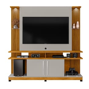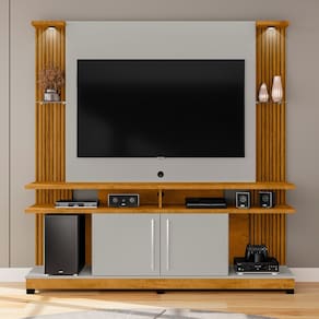 Características: Estrutura em MDP Tampo central e prateleira em MDP de 25mm Painel, portas e rodapé em MDP de 15mm 2 prateleiras de vidro 6mm Suportes metálicos cromados 2 Portas Dobradiças metálicas Puxadores em alumínio anodizado Iluminação em LED Espaço para TV de até 60 polegadas