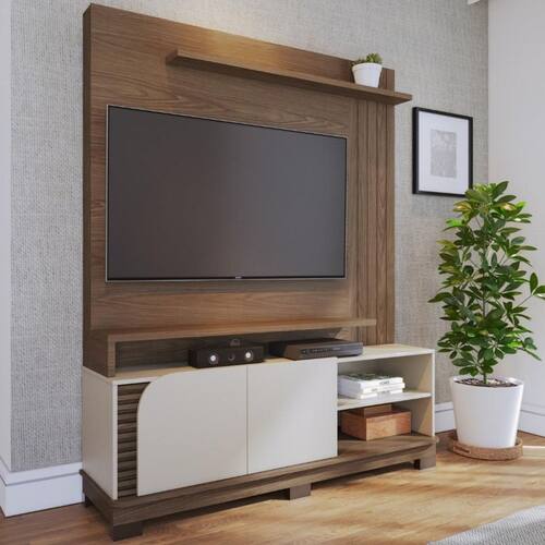 Características: Estrutura em MDP e MDF Acabamento em Pintura P.U 2 Portas Detalhe ripado Pés de plástico Suporta TVs até 65 Polegadas