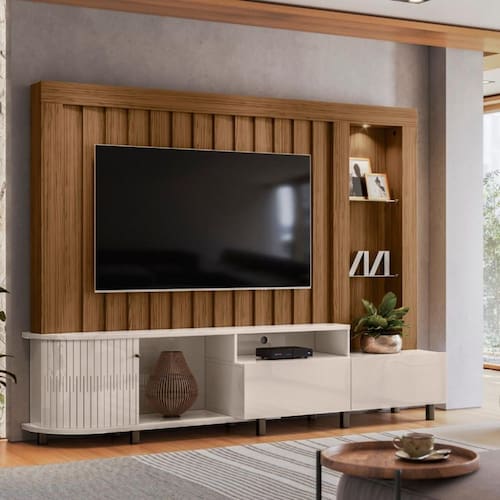 A Estante Home Le Mans da Madetec é uma peça versátil e estilosa para a sua sala de estar. Fabricada em MDP -Medium-Density Particleboard- com acabamento em pintura DIP. Possui detalhes curvos no tampo e na base, além de luminária de LED para um toque moderno e funcional, suporta TVs de até 70 polegadas e um peso total de 43 kg. Esse modelo combina funcionalidade com um design moderno, ideal para quem busca funcionalidade e elegância na sala de estar.