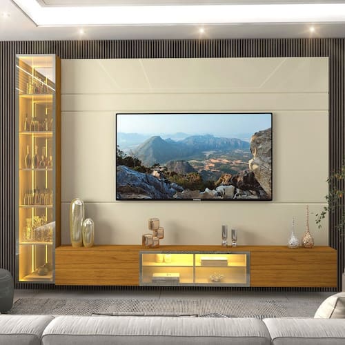 A Estante Home para TV até 85 Polegadas com Cristaleira LED e Vidro Reflecta 4 Portas em MDF Luminare Gelius é a peça perfeita para transformar sua sala em um espaço ainda mais sofisticado. Projetado para quem busca elegância e praticidade, ele suporta TVs de até 85 e se destaca pelas portas em vidro reflecta com moldura de alumínio, conferindo um toque moderno ao ambiente. Com a tecnologia Push to Open, basta um leve toque para abrir. A cristaleira, com espelhos ao fundo, cria um impressionante efeito de profundidade infinita, enquanto a iluminação em LED, com 120 pontos de luz em tom quente, adiciona charme e aconchego ao espaço.