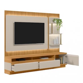 A Estante Home Ripada para TV até 70 Polegadas com LED 1 Porta 2 Gavetas Linea Brasil é projetado para acomodar TVs de até 70 polegadas. Equipado com duas gavetas e uma Porta com puxadores cava em alumínio, oferece amplo espaço de armazenamento. Além disso, possui três prateleiras para exibir objetos decorativos, duas das quais estão equipadas com iluminação em LED. O Painel em ripado e o Painel suspenso com iluminação em LED adicionam um toque de modernidade ao conjunto. O módulo lateral pode ser montado tanto no lado direito quanto no esquerdo do móvel, proporcionando flexibilidade na disposição do ambiente.