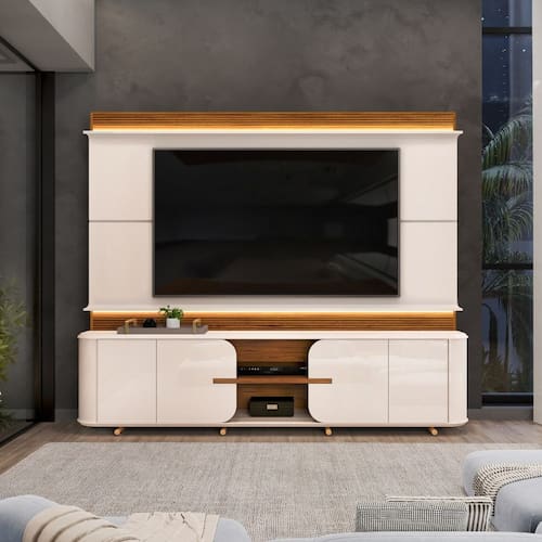A Estante Home Ripada para TV at? 75 Polegadas LED 4 Portas Lord DJ M?veis ? a escolha ideal para quem busca sofistica??o e eleg?ncia na sala de estar. Com um design refinado, possui tampo e base em MDF de 25mm chanfrado, cantoneiras curvas e portas centrais moldadas com recorte usinado, proporcionando um visual fluido e funcional. As portas laterais contam com fecho toque, garantindo modernidade. O painel superior traz ripados canelados e LED embutido, criando uma ilumina??o aconchegante e destacando os detalhes do m?vel. Suporta TVs de at? 75 e combina modernidade com p?s met?licos dourados. Feito com MDF sustent?vel, une durabilidade, resist?ncia e compromisso com o meio ambiente. Mais do que um m?vel, o Home Lord transforma sua casa com charme e estilo.
