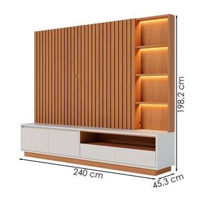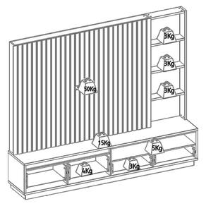 Estante Home Cancún une design contemporâneo e funcionalidade para transformar sua sala. Produzida em MDP (25, 15 e 12 mm) e HDF (3 mm), e acabamento em pintura UV texturizada. Composto por detalhes em ripas largas, 5 nichos (4 deles com luminárias LED luz quente), 2 gavetas e 2 gavetões com corrediças telescópicas. Além de passa fios embutido, suporta TVs de até 82 polegadas com segurança. Este produto chegará em sua casa separado em 4 volumes