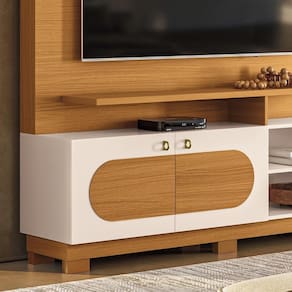 Moderna e sofisticada, a Estante Home Theater Axis é perfeita para valorizar sua sala de estar. Produzida em MDP com pintura UV de alta resistência, conta com 2 portas com dobradiças metálicas e puxadores dourados que trazem um toque elegante. Seu design se destaca pelos apliques decorativos com formas curvas e pelo tampo e prateleira superior de 25mm, garantindo robustez. Além disso, acompanha pés que elevam o móvel, proporcionando praticidade na limpeza. Ideal para TV até 60, une beleza e funcionalidade em um só produto.
