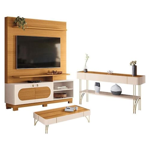 Estante Home Theater Axis Cinamomo Off White com Mesa de Centro Cadenza e Aparador Vivant Off White Cinamomo - HB Móveis