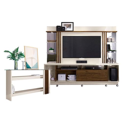 Estante Home Theater com Rodízios e Aparador Frizz Gold Off White Savana – Madetec