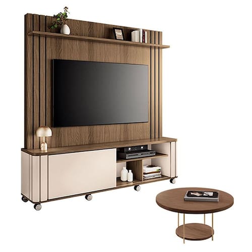 Estante Home Theater Trinus Castanho Off White com Mesa de Centro Sky Castanho - HB Móveis