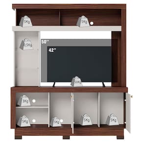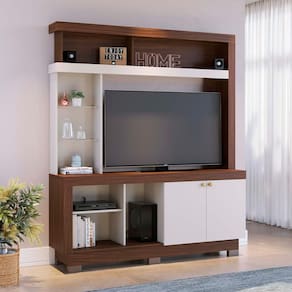 Estante Home Valenca, design elegante e funcional para transformar sua sala de estar. Estrutura em MDP/MDF (15 e 12mm) com acabamento em pintura UV texturizada. Possui portas de giro, nichos decorativos funcionais com espaço para auto falante, passa fios, prateleiras laterais em vidro (4mm), e pés plásticos (montagem opcional). Suporta com segurança TVs de até 50 polegadas. Este produto será entregue em 2 volumes.