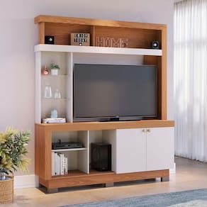 Estante Home Valenca, design elegante e funcional para transformar sua sala de estar. Estrutura em MDP/MDF (15 e 12mm) com acabamento em pintura UV texturizada. Possui portas de giro, nichos decorativos funcionais com espaço para auto falante, passa fios, prateleiras laterais em vidro (4mm), e pés plásticos (montagem opcional). Suporta com segurança TVs de até 50 polegadas. Este produto será entregue em 2 volumes.