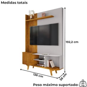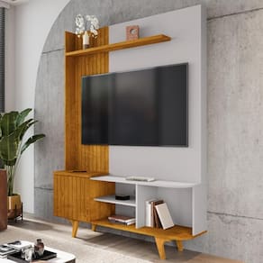 Estante Home Corumbau, móvel que une praticidade e elegância para compor sua sala. Estrutura em MDP/MDF (15/25mm) com acabamento em pintura UV texturizada. Possui porta basculante com dobradiças metálicas, frisos decorativos (MDF 15mm), tampo e prateleira superior (MDP 25mm), bordas curvas, passa-fios, nicho aberto e pés em madeira maciça. Suporta TV's de até 55 polegadas com segurança. Fixação por meio de parafusos. Este produto será entregue em 1 volume.