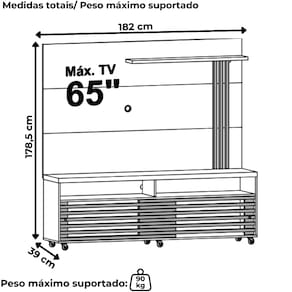 Estante Home Frizz,  desenvolvida para aliar praticidade e acabamento com destaque frisado. Estrutura em MDP 15/25/40mm (base 15mm, prateleiras/frisos 25mm e tampo 40mm), com capacidade para TVs de até 65 polegadas (suporta até 90 kg distribuídos). Possui 02 nichos abertos, 01 prateleira superior com luminária LED embutida, além de frisos decorativos nas laterais. Conta também com 02 passa-fios, puxadores cromados (em metal) e 06 rodízios sem freio, (sendo 5 em silicone e 1 em plástico). Acabamento em pintura UV texturizada (fosca e brilho). Este móvel chegará separado em 02 volumes.