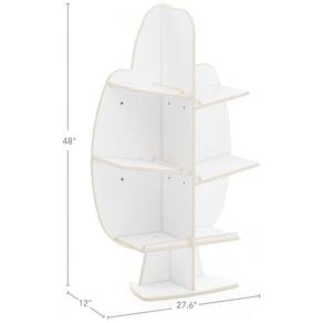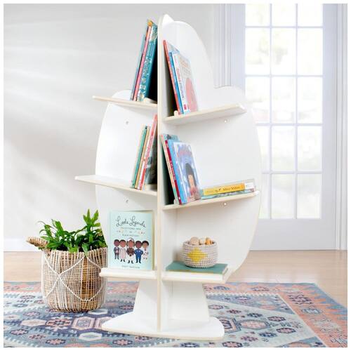 Estante infantil vertical em formato de árvore para armazenamento e exposição de livros e materiais de aprendizagem em salas de aula, quartos infantis e brinquedotecas. A estrutura em compensado de bétula, com acabamento branco de fácil limpeza, cantos arredondados e estilo contemporâneo, funciona como ponto de destaque visual no ambiente e organiza o acervo em altura acessível para crianças.
