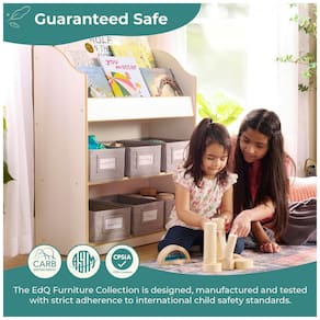 A limpeza recomendada é feita com pano seco ou levemente umedecido na estrutura, preservando o acabamento em bétula branca, enquanto as caixas de tecido podem ser removidas para aspiração ou limpeza pontual. A coleção EdQ da Guidecraft foi criada para atender a necessidades de organização em ambientes educativos, com móveis modulares robustos e proporções adequadas para crianças, apoiando autonomia na escolha e guarda de livros e brinquedos.?