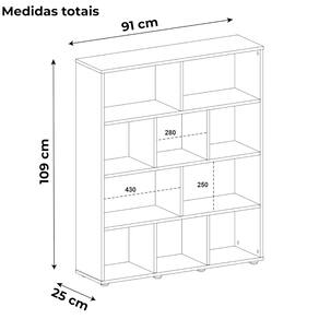 Estante Livreiro que trás um charme a mais pro seu lar. Estrutura em MDP/MDF de 15 mm, com 10 nichos distribuídos (4 com fundo fechado e 6 abertos) que suportam até 3kg cada. Além de contar com 8 sapatas em plástico ABS e acabamento feito em pintura UV texturizada (fosco). Este móvel chegará em sua casa separado em 01 volume.