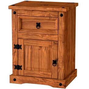 Característica da Mesa de Cabeceira : - Madeira de Pinus de Reflorestamento; - 100% Maciço; - 1 Porta com Dobradiça metálica; 1 Gaveta com Corrediça metálica; - Acabamento com Verniz Fosco; - Acessórios em ferro fundido com pintura epóxi preta fosca; - Não acompanha itens de decoração ou quaisquer objetos fora o móvel na imagem;