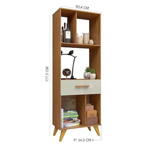Charmosa e versátil, a Estante Livreiro 6207 combina funcionalidade com um toque retrô. Produzida em MDP com pintura UV, possui 1 gaveta com montagem flexível e puxador em MDF, além de pés em madeira 20cm. Ideal para livros, itens decorativos e organização em diversos ambientes e suporta até 18kg distribuídos.
