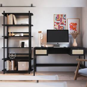 Com estrutura robusta, você terá amplo espaço para armazenar seus livros favoritos, exibir coleções e acomodar objetos de decoração que contam a sua história, enquanto a mesa para computador será o palco de grandes ideias e criações. Além disso, os pés em madeira maciça garantem não apenas resistência, mas também um toque de charme rústico que complementa qualquer ambiente. Para completar o charme, o aplique em tela sintética no painel traseiro da estante e nas duas gavetas da escrivaninha traz um toque artesanal, suave e acolhedor.