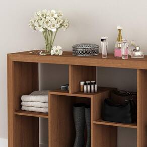aparador repleto de objetos decorativos!! Sensacional, né? Tudo graças a suas 7 prateleiras que formam 8 nichos, ótimos para abrigar itens diversos. Ah, e ela conta com estrutura em MDP e acabamento em pintura UV de qualidade, agregando durabilidade e resistência!