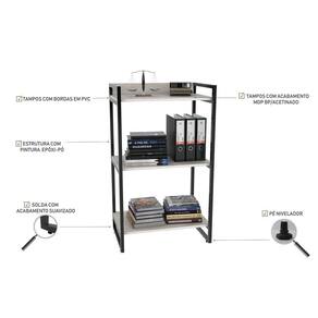 Características do Produto Material da Estrutura: MDP BP 15 mm/Aço. Peso Suportado: 5 Kg por prateleira. Tonalidade: Snow. Acabamento: BP Acetinado e Pintura Epóxi. Escala de Brilho: Fosco. Possui Prateleiras: Sim. Material das Prateleiras: MDP. Possui Pés: Sim, Aço com pintura epóxi. Possui Rodízios: Não. Diferenciais: - Design moderno. - Fita de borda em PVC. - Pés niveladores. - Solda com acabamento suavizado. - Estrutura reforçada. Sistema de Montagem: Minifix / Cavilhas / Parafs. Manual de Montagem: Sim. Complexidade da Montagem: Baixa. Conteúdo da Embalagem: 1 Estante. Volumes: 1 Volume. Garantia do Fabricante: 3 meses contra defeito de fabricação. Montagem: Recomendamos que seja feita por um profissional. Recomendação de Limpeza: Utilize pano levemente úmido.
