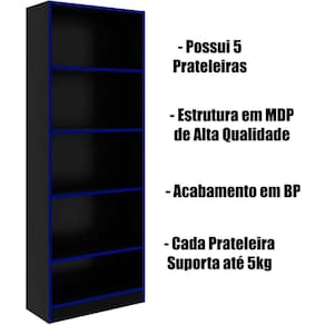 Estante Multiuso Gamer Livreiro Office 5 Prateleiras Preto/azul A Estante Multiuso Gamer Livreiro Office foi projetada para oferecer praticidade e um visual moderno que combina perfeitamente com ambientes gamer, office ou residenciais. Seu design é versátil, permitindo organizar livros, objetos de decoração, periféricos e acessórios, deixando o espaço muito mais organizado e estiloso. Dimensões da Estante Multiuso Gamer Livreiro Office 5 Prateleiras: - Altura: 160 cm - Largura: 59,8 cm - Profundidade: 25,5 cm