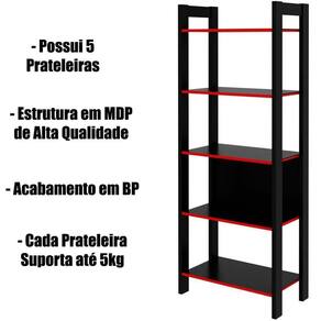 Estante Multiuso Gamer Livreiro Office 5 Prateleiras Preto/vermelho A Estante Multiuso Gamer Livreiro Office foi projetada para oferecer praticidade e um visual moderno que combina perfeitamente com ambientes gamer, office ou residenciais. Seu design é versátil, permitindo organizar livros, objetos de decoração, periféricos e acessórios, deixando o espaço muito mais organizado e estiloso. Dimensões da Estante Multiuso Gamer Livreiro Office 5 Prateleiras: - Altura: 165,5 cm - Largura: 65 cm - Profundidade: 35,5 cm