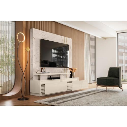 """A New Apolo é ideal para TVs de até 75 polegadas, oferecendo funcionalidade e design moderno. Fabricada em MDP com revestimento em pintura UV e acabamento em Hot Stamping, conta com dimensões de 1,830m x 1,760m x 0,405m e suporte para até 65 kg distribuídos.