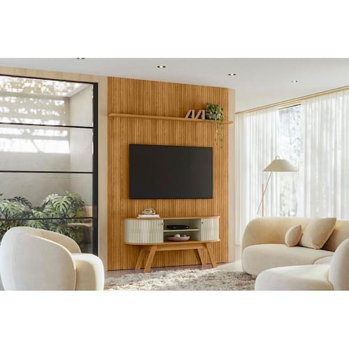 Fabricada com estrutura em MDP e MDF de 12, 15 e 25mm, ela apresenta um revestimento em pintura UV de alta qualidade, que proporciona durabilidade e um acabamento refinado. Suas dimensões incluem um painel de 1,790 x 2,445 x 0,185m e uma bancada de 1,360 x 0,680 x 0,355m, ambos projetados para suportar TVs de até 65 polegadas, com entradas específicas de 1,790 x 1,200mm no painel e 1,360 x 0,355m na bancada. O painel possui um elegante frisado em MDF com design em baixo relevo, enquanto a bancada conta com tampo e base com detalhes curvos que destacam a modernidade do conjunto. O produto inclui duas portas flexíveis em MDF, duas prateleiras para organização adicional, puxadores em poliestireno e pés retrô que agregam charme e estilo. Com um sistema de montagem prático do tipo Girofix e capacidade para suportar até 45kg, a Composição New Silverston é perfeita para transformar sua sala em um ambiente acolhedor, moderno e funcional.