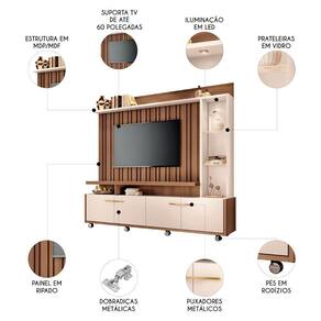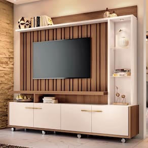 O Home Para Sala possui um visual marcante com o autêntico ripado montado em larguras intercaladas, que dá um toque de sofisticação e modernidade ao ambiente. Além disso, ele conta com quatro portas com dobradiças laterais e puxadores metálicos em tom dourado, que oferecem espaço para guardar objetos e acessórios. O nicho lateral com prateleiras de vidro 6mm é ideal para expor itens decorativos, livros ou eletrônicos. A luminária LED embutida ilumina o painel e cria um clima aconchegante e elegante. O Painel Para também possui rodízios cromados de 50mm, que facilitam a movimentação e a limpeza do móvel. O produto é produzido em MDP e MDF, garantindo resistência e durabilidade. O acabamento é feito com pintura UV, que protege o móvel contra riscos e desgastes.