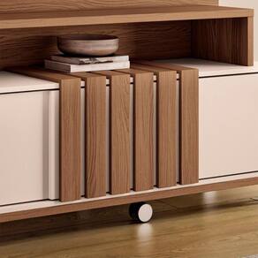 Com um Painel Para que suporta até 65 polegadas, o Home Theater conta com duas portas de correr com trilho em alumínio, que garantem um deslizamento suave e silencioso. Os puxadores em poliestireno têm um Formo exclusivo e um acabamento na cor dourada, que dão um toque de sofisticação ao móvel. O detalhe ripado na parte frontal do rack é um charme à parte, que valoriza a decoração da sua sala. O tampo e a prateleira superior têm espessura de 25mm, o que confere resistência e durabilidade ao produto. Além disso, ele tem um nicho amplo para os aparelhos eletrônicos ou decorações, ele possui também rodízios cromados de 50 mm, que facilitam a movimentação e a limpeza do ambiente. O móvel é produzido em MDP e MDF de 25mm e 15mm, materiais de alta qualidade e ecologicamente corretos.