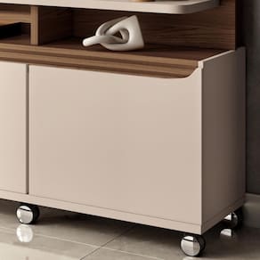 Os compartimentos internos das portas laterais oferecem amplo espaço para organizar seus objetos, enquanto a gaveta central mantém seus itens mais utilizados à mão. Além disso, a versatilidade dos rodízios permite que você mova a estante com facilidade, adaptando-se às suas necessidades e ao layout do ambiente. Para completar, o tampo com cantos arredondados não apenas confere um toque de suavidade ao design, mas também garante segurança e conforto.