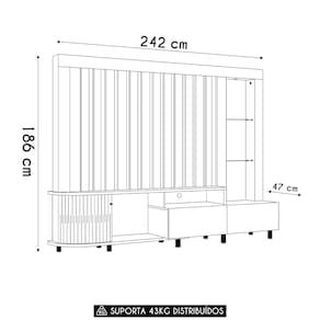Fabricada com chapas de MDP de 15 e 25mm, o móvel combina resistência e durabilidade. Seu Painel de TV com detalhes sobrepostos cria um visual sofisticado, enquanto a luminária LED integrada valoriza o ambiente. O destaque fica por conta da porta deslizante flexível em MDF, que oferece praticidade e um toque de exclusividade com seu design curvo. As prateleiras de vidro de 5mm garantem espaço para objetos decorativos, enquanto o nicho central é ideal para acomodar aparelhos eletrônicos. Além disso, a Estante Para Sala conta com duas gavetas equipadas com corrediças telescópicas, proporcionando organização eficiente. Os pés em poliestireno asseguram estabilidade e um acabamento refinado, complementado pelo puxador em bronze que harmoniza com o visual, o Home Theater é ideal para TVs de até 70 polegadas, otimizando seu espaço e elevando o conforto da sua sala.