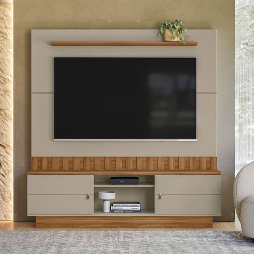 Este lindo home florianópolis possui prateleira superior de 2,5cm, possui também detalhe ripado no painel, portas em MDF frisada de correr e seus puxadores são em poliestireno que assemelha à couro natural, suporta TV de até 70". Produto Montado: Sim Acabamento da Porta: Pintura UV Acabamento da Prateleira: Pintura UV Altura dos Pés: 10 cm Altura Máxima dos Pés: 10.0000 Ambiente Principal: Sala de Estar codigo_ean: 7900288163493 Complexidade da Montagem: Alta: deve ser montado por um montador especializado Cor: Grigio Fosco / Amendoa Cor do Produto: Grigio Fosco / Amendoa Cor Interna: Grigio Escala de Brilho: Semi-Fosco Escala de Brilho da Porta: Fosco Escala de Brilho da Prateleira: Semi-Brilho Espessura do Painel: 1,2 cm Espessura do Tampo: 25 mm Fixação na Parede: Não Ideal para TVs até (Polegadas): 70 Informações Complementares: Prateleira Superior De 25mm; Detalhe De Painel Ripado, Porta De Correr Em Mdf Frisada, Puxador Em Poliestireno Que Assemelha A Couro Natural, Suporta Tv De Até 70" Itens Inclusos: Home embalado em isomanta, papelão e termo encolhível Linha ou Coleção: Florianópolis Manual de Montagem e Instalação: https://product-hub-prd.madeiramadeira.com.br/183481097/documents/9ec4a578-54d8-4eac-b1ef-0a6d3abc666f2959502277817484361335599.pdf Marca: Mobler Material da Porta: MDF Material da Prateleira: MDP Material do Puxador da Porta: Poliestireno Material dos Pés: ABS Material Principal: MDF/MDP Necessita Montagem: Sim Origem do Produto: Nacional Peso: 60,9 kg Peso Máximo por Prateleira: 3 kg Possui Espelho: Não Possui iluminação: Não Possui Nichos: 02 Possui Passa Cabos: Sim Possui Pés: 08 Possui Portas: Sim Possui Prateleiras: Sim Possui Rodízio: Não Possui Vidro: Não Recomendações de Uso, Manutenção e Limpeza: Para conservar a aparência e a durabilidade do produto: - Utilizar pano macio e úmido; - não usar solventes ou abrasivos Sapatas Niveladoras: Não Sistema de Montagem: Parafusos, Cavilhas, Pregos Suporta Até (kg): 50 kg Suporte de TV Universal Incluso: Não Tipo de Dobradiça/Corrediça da Porta: Metálica Tipo de Puxador da Porta: Externo
