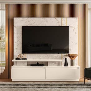 Prof.: 405mm Ambiente Principal: Sala de Estar Complexidade da Montagem: Média: pode ser montado por mais de uma pessoa e/ou necessite de maior conhecimento para montagem Cor: Calacata/Off White Cor do Produto: Calacata/Off White Escala de Brilho: Brilhante Ideal para TVs até (Polegadas): 75 Informações Complementares: Perfis com Acabamento em Hot Stamping; Painéis em MDP 15 e 40mm, 2 gavetas com corrediças telescópicas; Indicado para TV até 75 polegadas. Itens Inclusos: Peças; Acessórios; Manual de montagem Linha ou Coleção: Linha Eras Manual de Especificação Técnica: https://product-hub-prd.madeiramadeira.com.br/894228/documents/830bf6f1-9998-411f-b716-27e1a76cc6f897037653dimensoesdoproduto.pdf Manual de Montagem e Instalação: https://product-hub-prd.madeiramadeira.com.br/894228/documents/e8a95b53-e691-43a4-9191-fc61d8dc882c97036653dimensoesdoproduto.pdf Material Principal: MDP Montagem Flex: Não Necessita Montagem: Sim Origem do Produto: Nacional Peso: 72 kg Possui Espelho: Não Possui iluminação: Não Possui Nichos: Não Possui Pés: Não Possui Portas: Não Possui Prateleiras: Não Recomendações de Uso, Manutenção e Limpeza: Para a limpeza utilizar um pano limpo e seco. Não limpar com produtos abrasivos ou escovas;Não deixar exposta à luz do sol diretamente pois isso irá diminuir a vida útil do produto;Este produto Não é recomendado Para ambientes externos onde possa receber chuva. Sistema de Montagem: Parafusos, Cavilhas e Minifix Suporta Até (kg): 65 kg Suporte de TV Universal Incluso: Não