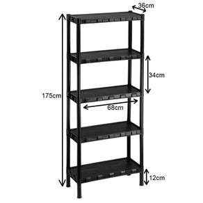Estante plástica grande preta com 5 prateleiras Cor: preta Estante plástica preta 05 prateleirasDescriçãoSeu design moderno e exclusivo permite o uso em qualquer ambiente de sua casa, como Quarto, dispensa, lavanderia, garagem, escritório, cozinha, sala e banheiro. Especificações Prateleiras produzidas em polipropileno Suporta até 7 kg por prateleira Fácil montagem e desmontagem, não exigindo qualquer tipo de ferramenta. Tamanho do produto 175 cm altura x 68 cm largura x 36 cm comprimento . Marca: agraplast