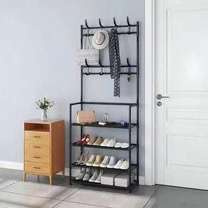 Ideal para quartos, closets, varandas, salas ou halls de entrada, ela comporta até 12 pares de sapatos na parte inferior e ainda conta com suportes superiores para pendurar cabides, bolsas ou roupas.